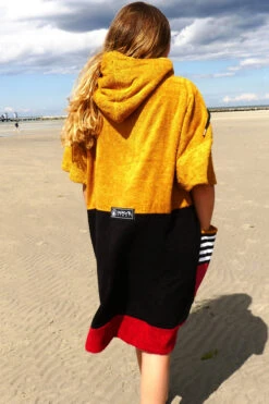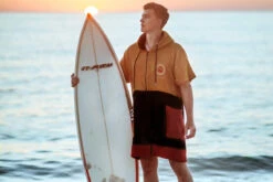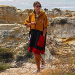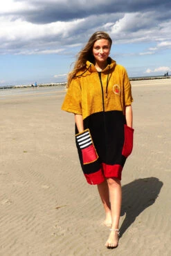 The Dusty zip poncho is incredibly comfortable and eye-catching with its gold, black and red colour scheme. The Dusty is available in size M and is made from 60% Bamboo and 40% cotton (certified Oeko-Tex Standard 100). Medium sized and easily big enough to pull over a wetsuit, it is perfect for both women and men. The carefully selected fabrics are particularly fluffy and kind to your skin and are also very functional. This poncho has a particularly warm, twin-layer hood with a high collar and pull cord threaded through metal eyelets. The added feature of the Dusty is its full length zip down the front – perfect for those who don’t want to pull the poncho over their head. The large side pockets offer plenty of space for carrying your stuff. The pockets are also especially great for warming your hands on those chilly days on the beach!