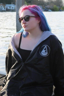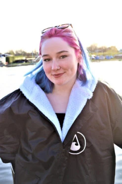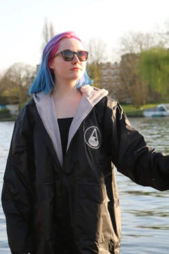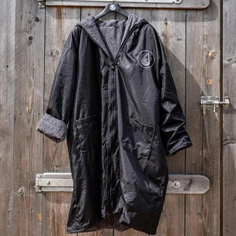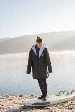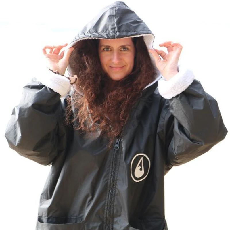 The Jety is size L/XXL and easily fits over your wetsuit. The carefully selected fabrics are particularly cozy and kind to your skin and are also very functional. This poncho has very warm side pockets and a fully towelling-lined hood. The Jety fastens using an incredibly sturdy full length zip up the front. The large side pockets offer plenty of space for carrying your stuff and are especially great for warming your hands on those chilly days on the beach!