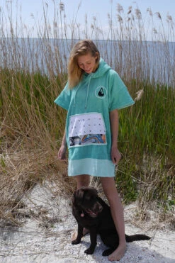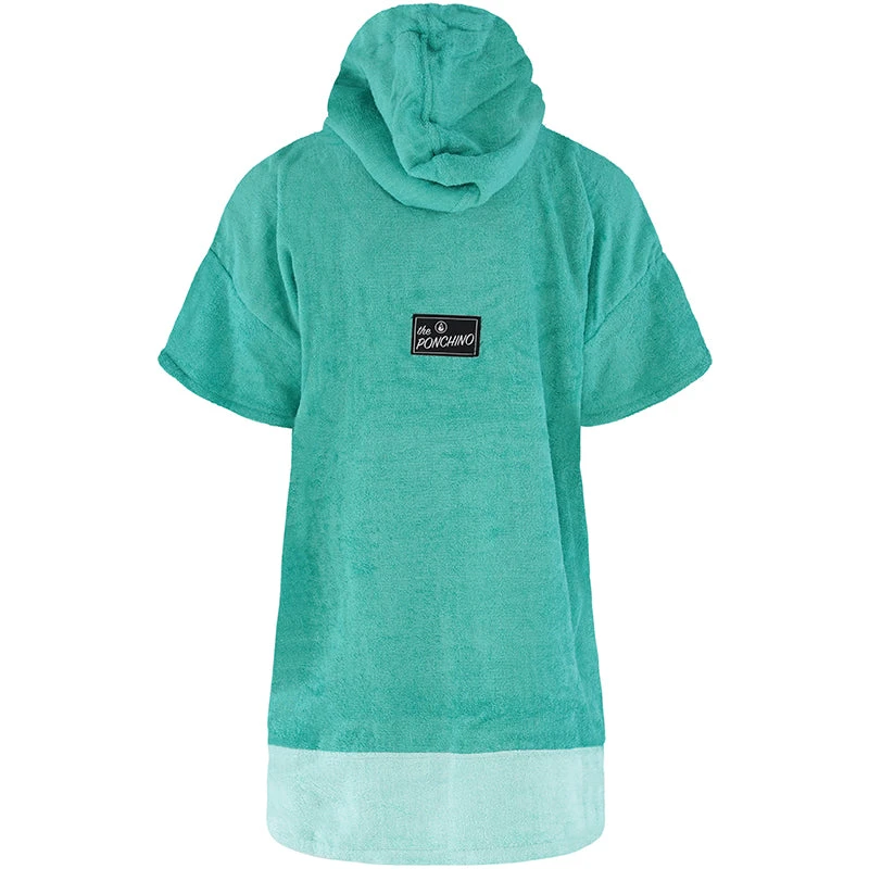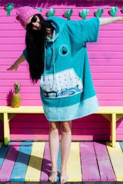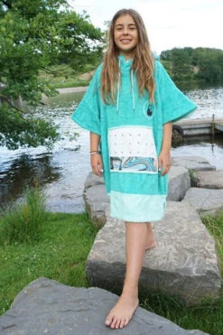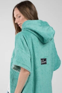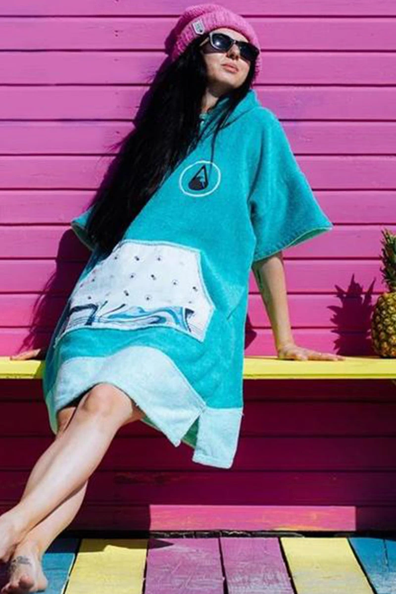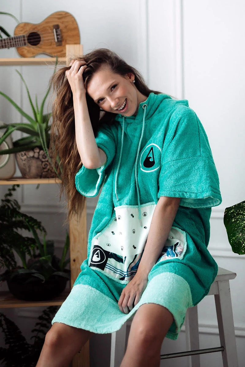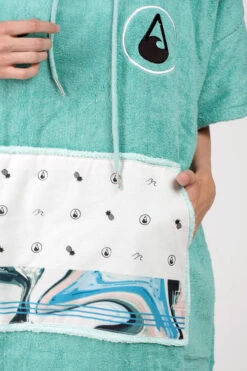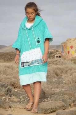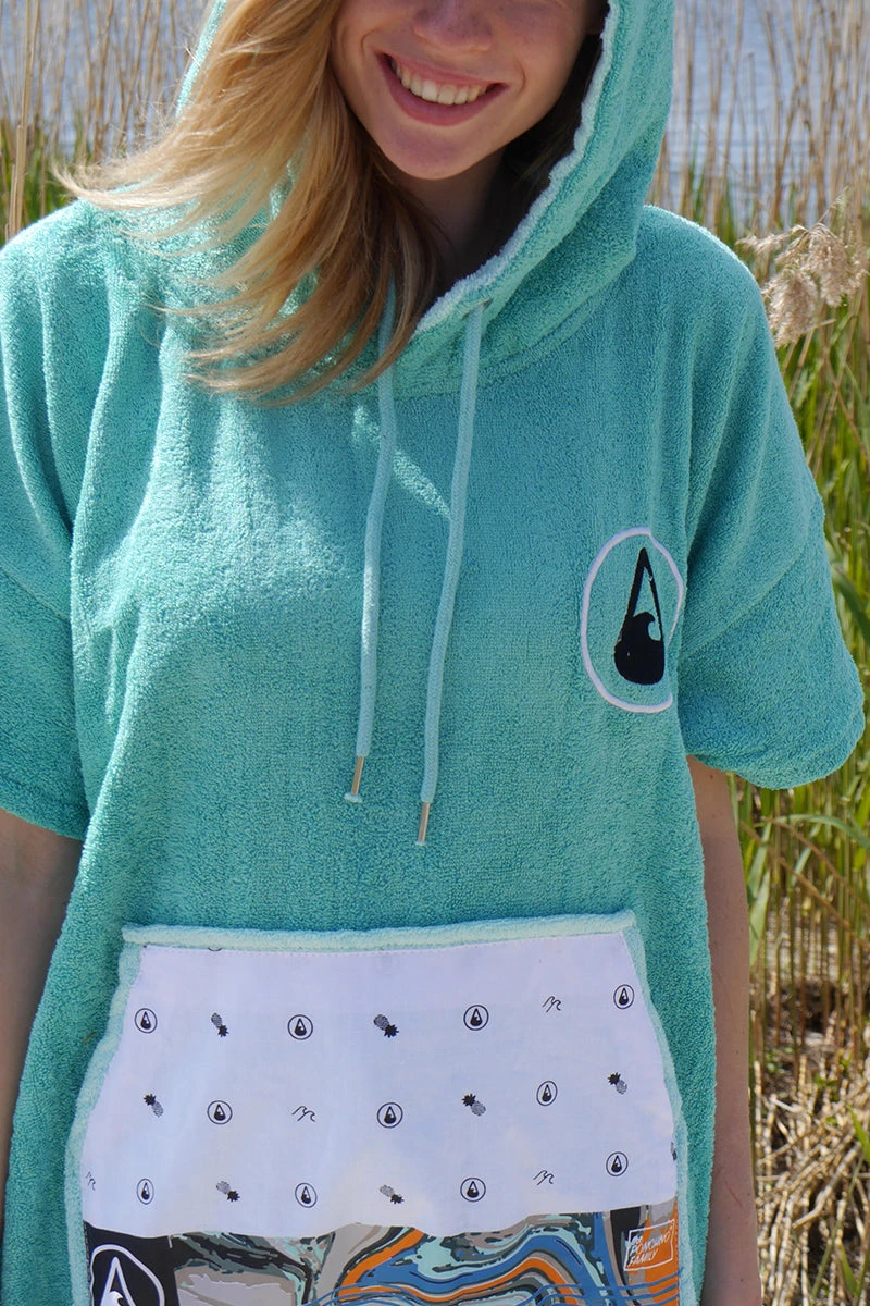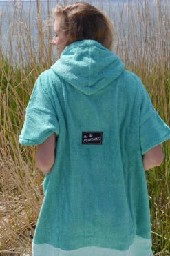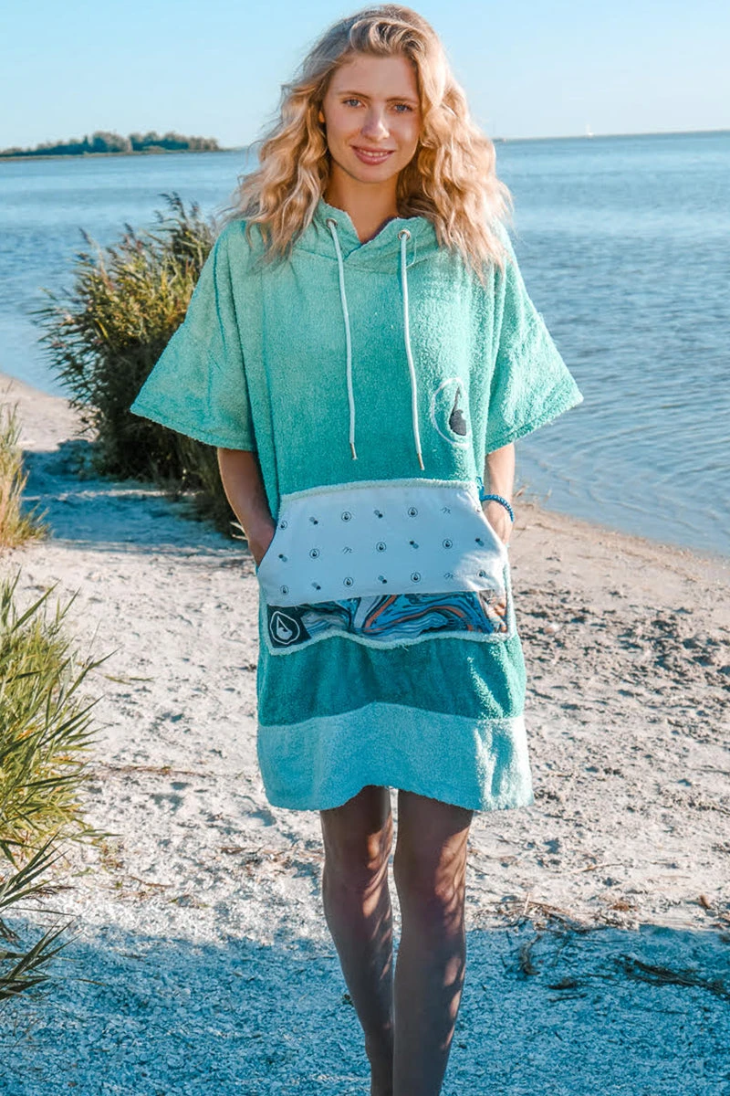 Our Liz poncho is incredibly comfortable and really celebrates the ocean with its aquamarine colour scheme and patterned soft cotton pocket panel. The Liz comes in size S and is made of 60% Bamboo and 40% cotton (certified Oeko-Tex Standard 100) and although a S size it is easily big enough to pull over a wetsuit. The carefully selected fabrics are particularly cozy and kind to your skin and are also very functional. This poncho has a particularly warm, twin-layer, colour-contrasting hood with a high collar and pull cord threaded through metal eyelets. The large front pocket offers plenty space for carrying your stuff and is especially great for warming your hands on those chilly days on the beach!