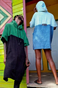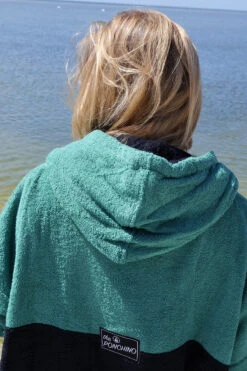 Our Move poncho is incredibly comfortable and looks very stylish with its dark jade green and black colour scheme. The Move comes in size L and is made of 100% cotton (certified Oeko-Tex Standard 100). Large sized, it is easily big enough to pull over a wetsuit. The carefully selected fabrics are particularly fluffy and kind to your skin and are also very functional. This poncho has a particularly warm, twin-layer hood with a high collar and pull cord threaded through metal eyelets. The large front pocket offers plenty space for carrying your stuff and is especially great for warming your hands on those chilly days on the beach!